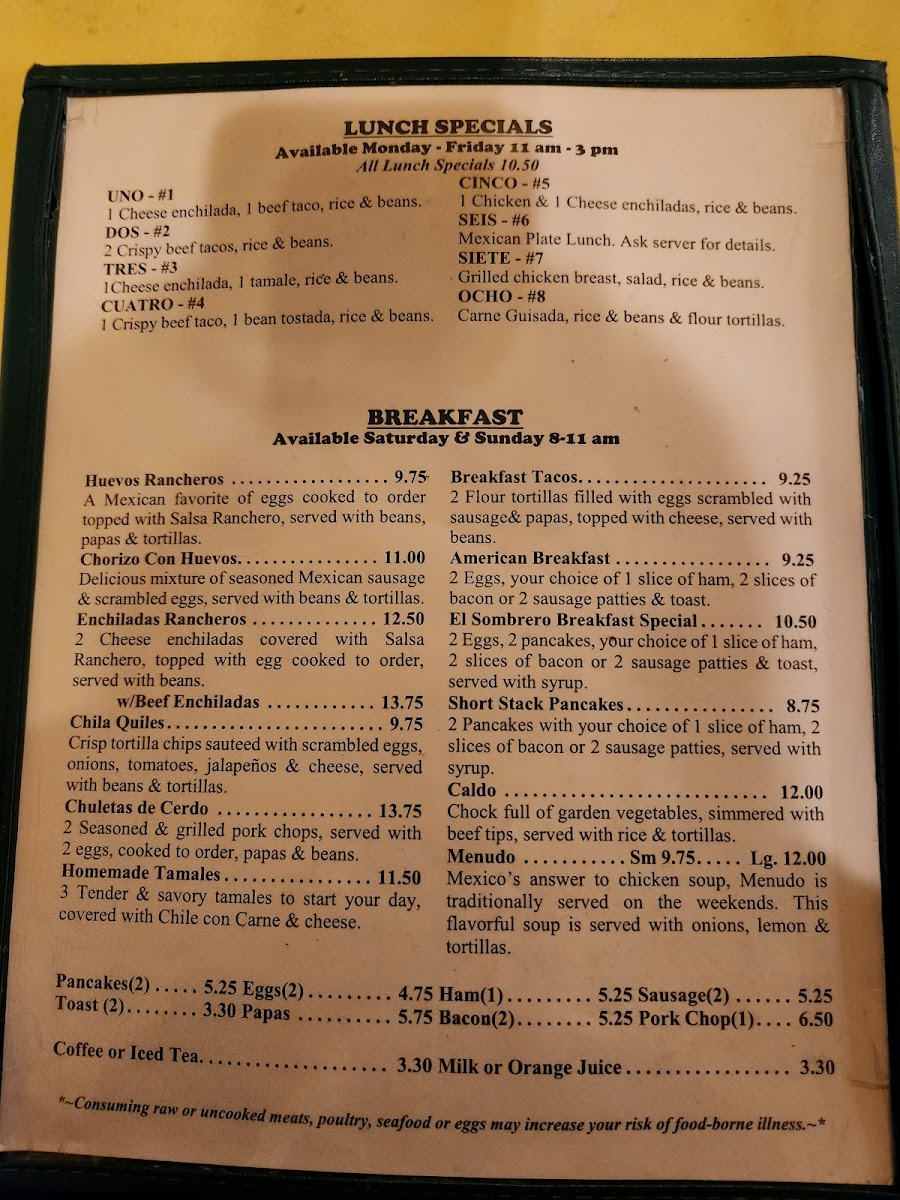 2 enchiladas filled with ground beef, topped with chile con carne & cheese. *Includes coffee, tea or soda of your choice.*Includes coffee, tea or soda of your choice.